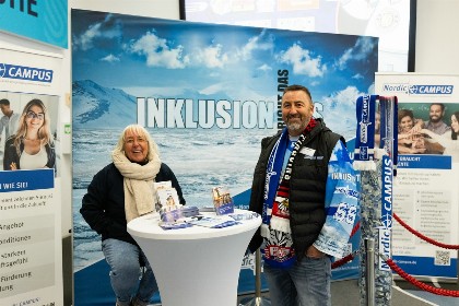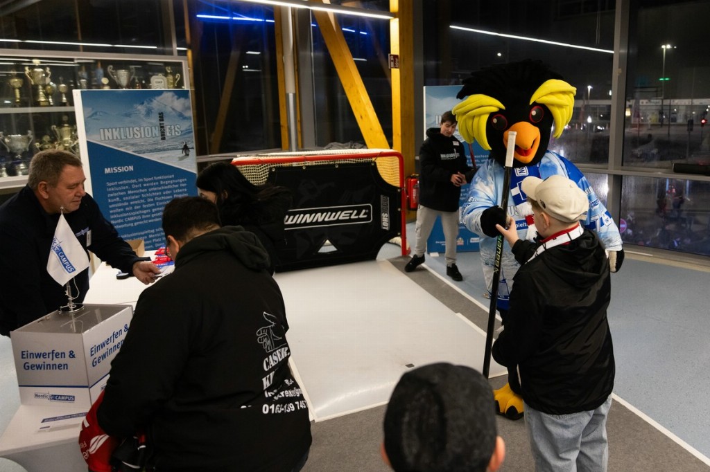 Viel Trubel herrscht rund um die Mitmachaktionen. Domenik und Raven Sean sorgen beim Penalty-Schießen für Nervenkitzel und Begeisterung. Viele Fans wagen den Schuss, es gibt tolle Preise zu gewinnen. „Der Stand war immer gut besucht, vor dem Spiel und in den Pausen war immer etwas los bei uns“, sagt Frank Koppenhagen vom Nordic CAMPUS. Sina begleitete das Schätzspiel, wo das Interesse groß war. Sechs originale und von den Spielern signierte Trikots können gewonnen werden, ein Highlight für viele Besucher.